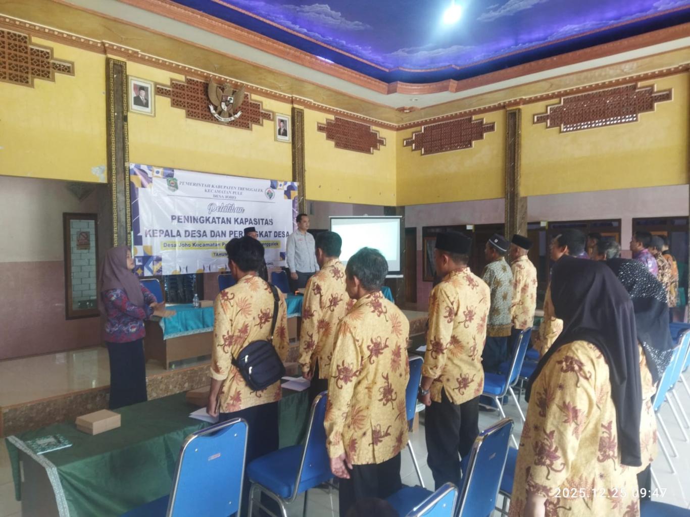 pelatihan peningkatan kapasitas Kepala Desa dan Perangkat Desa dilaksanakan di Desa Joho pada tanggal 25 Desember 2025. Kegiatan ini diikuti oleh Kepala Desa dan seluruh perangkat desa dengan tujuan meningkatkan pemahaman, kompetensi, serta profesionalitas aparatur pemerintahan desa dalam penyelenggaraan pemerintahan, pembangunan, dan pelayanan kepada masyarakat. Pelatihan dipandu oleh Ketua PMD Kabupaten Trenggalek. (AGUS DWI KARYANTO,S S.STP,M.A.P) sebagai pemateri, yang menyampaikan materi terkait penguatan tata kelola pemerintahan desa, optimalisasi perencanaan dan pengelolaan keuangan desa, peningkatan kualitas pelayanan publik, serta pentingnya integritas dan sinergi antarperangkat desa. Kegiatan berlangsung dengan tertib dan interaktif, ditandai dengan sesi diskusi dan tanya jawab, serta diharapkan mampu menjadi bekal dalam meningkatkan kinerja pemerintahan Desa Joho ke depan.